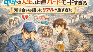1. 導入|「中卒=詰む」と言われる理由「中卒 人生ってやっぱり詰むのかな…」こんな不安を検索している人、多いと思います。正直に言います。中卒というだけで人生が詰むわけではありません。ただし――何も考えずに生きていると、本当に詰む確率はかな...